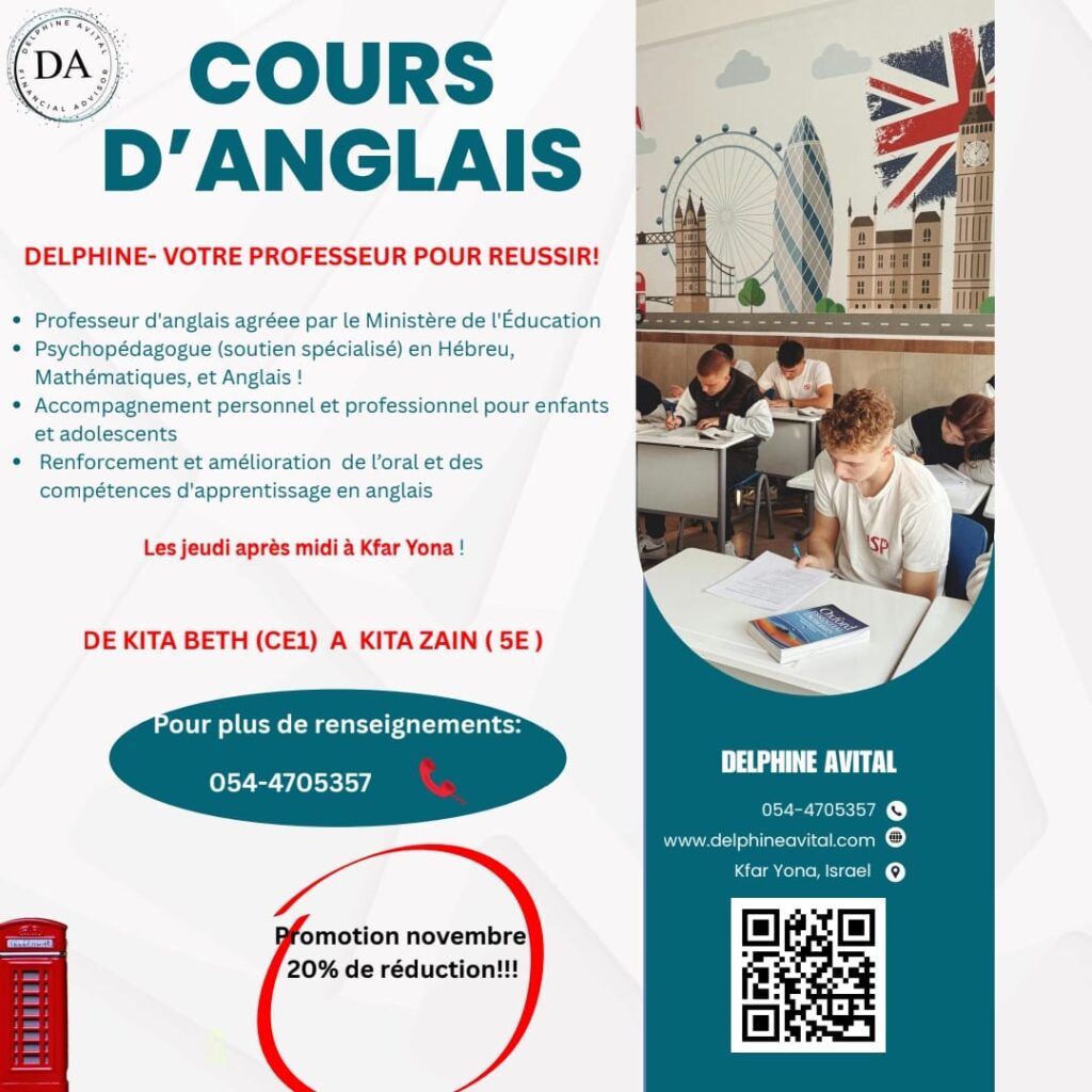 Pour les élèves du CP au CM1, Delphine Avital propose des cours de rattrapage en hébreu et en mathématiques avec des cours particuliers ou en petits groupes, des stratégies d’apprentissage, un renforcement de la confiance en soi, et du matériel adapté aux difficultés et capacités de chaque enfant dans une ambiance ludique. Pour les enfants du CP à la Terminale, des cours d’anglais sont disponibles avec des stratégies spécifiques pour améliorer la maîtrise de la langue, renforcer la confiance en soi à l’oral, et utiliser du matériel adapté et ludique.